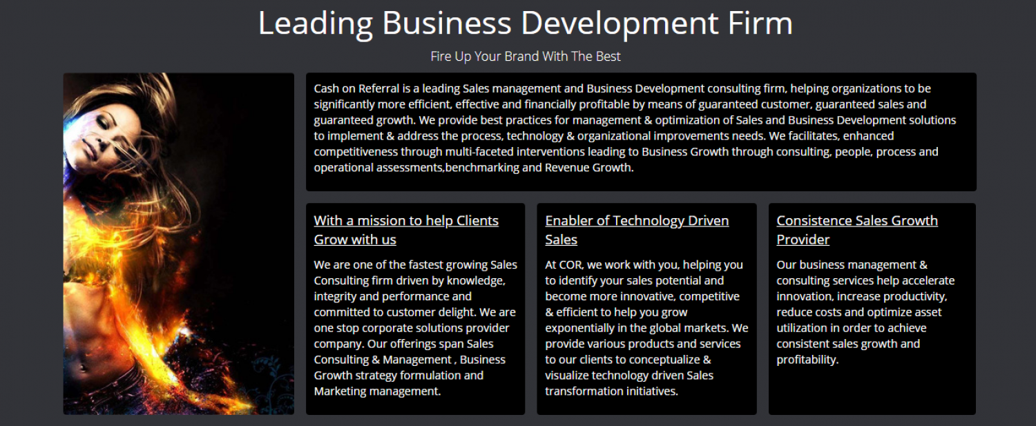 Cash on Referral is a leading Sales management and Business Development consulting firm, helping organizations to be significantly more efficient, effective and financially profitable by means of guaranteed customer, guaranteed sales and guaranteed growth. We provide best practices for management & optimization of Sales and Business Development solutions to implement & address the process, technology & organizational improvements needs. We facilitates, enhanced competitiveness through multi-faceted interventions leading to Business Growth through consulting, people, process and operational assessments,benchmarking and Revenue Growth
